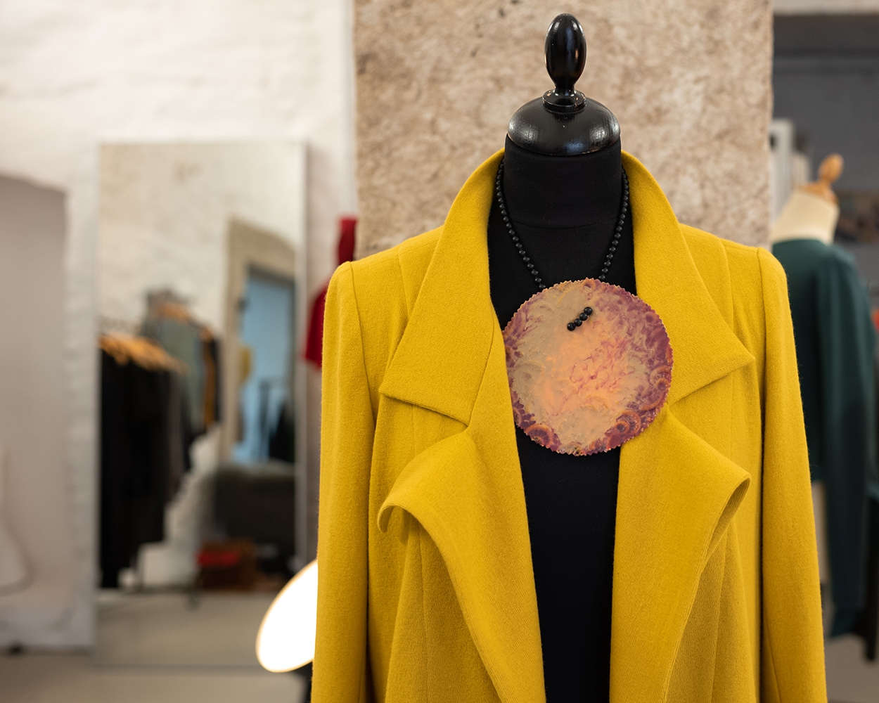 Gerade jetzt brauchen wir Farbe. Individuelles. Gute Qualität. Mantel aus Merino Strick aus kbT (kontrolliert biologischer Tierhaltung). Zum Wohlfühlen. Schmuck von MAXA Halmschlager.
