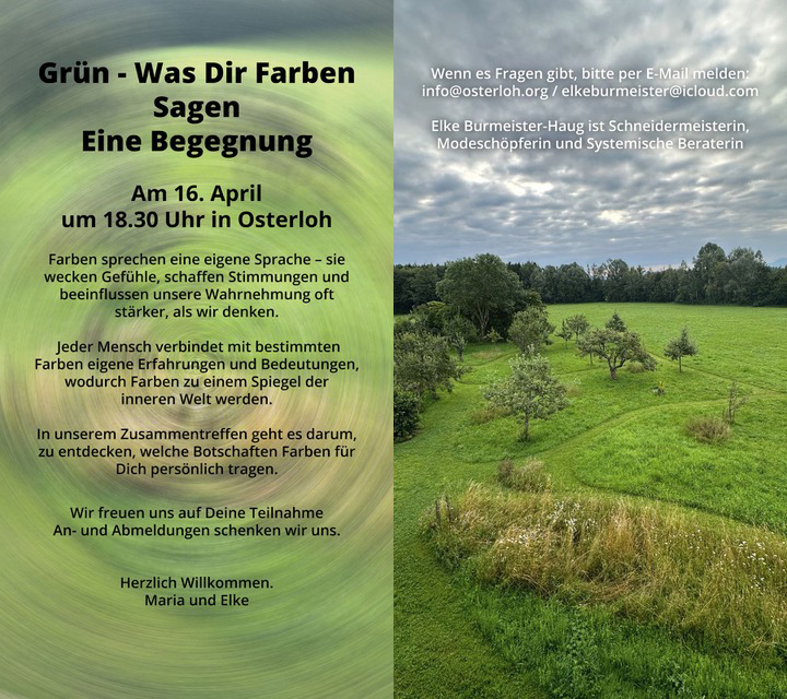 Am 16. April um 18.30 Uhr laden Maria und ich nach Osterloh zu einer gemeinsamen Begegnung mit der Farbe Grün ein. In diesem Zusammenkommen geht es darum, den eigenen Erfahrungen mit Farben Raum zu geben: Welche Erinnerungen verbinden wir mit ihnen? Welche Stimmungen lösen sie aus? Und welche Botschaften tragen sie vielleicht für unsere innere Welt?